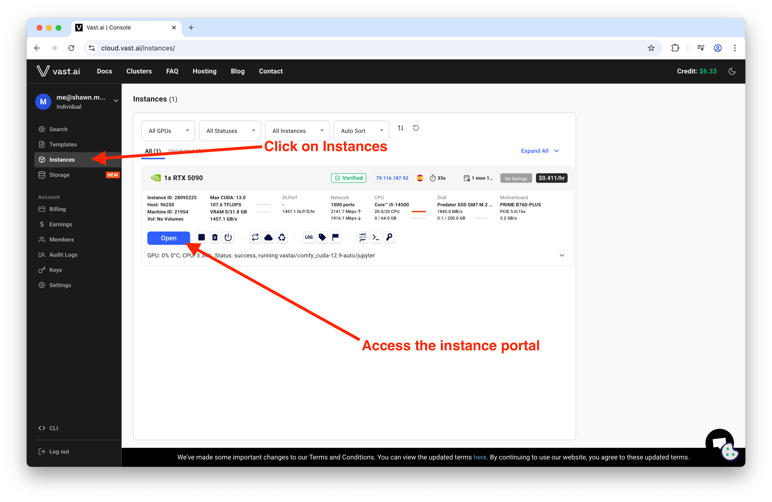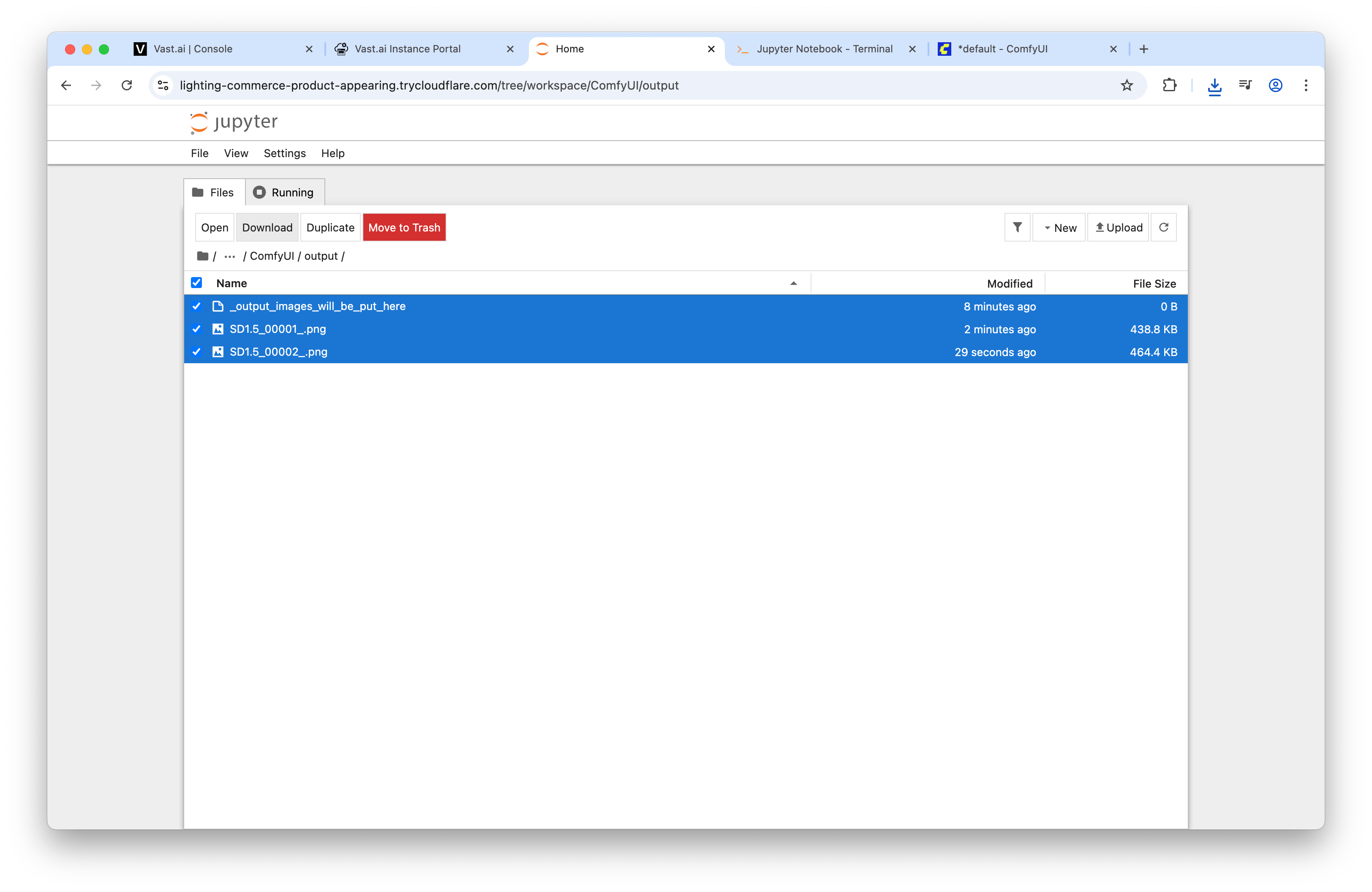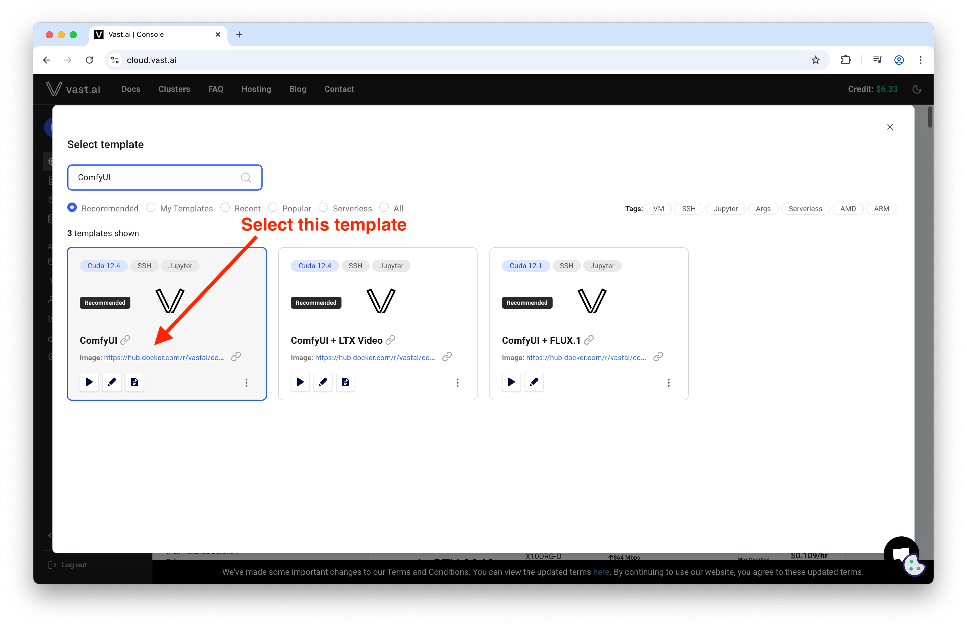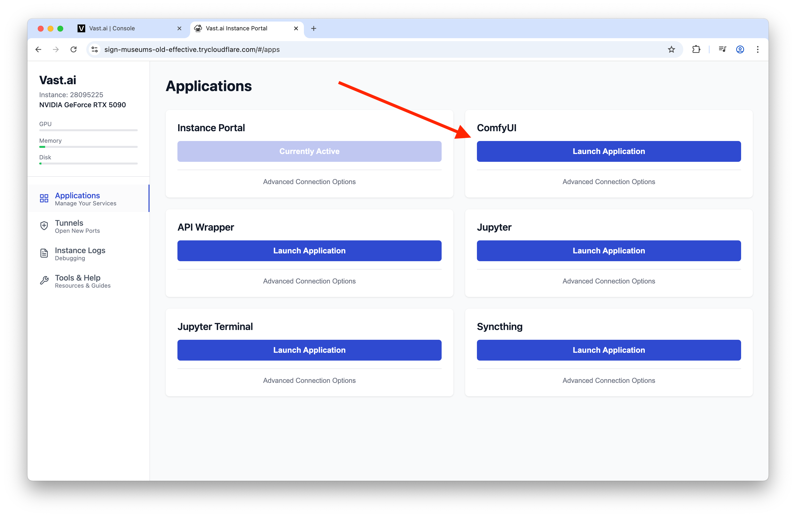 Use the Vast.ai ComfyUI template; it ships with CUDA, driver bindings, Jupyter, and the ComfyUI service configured. This avoids rebuilding PyTorch/CUDA stacks each time and trims cold-start time.