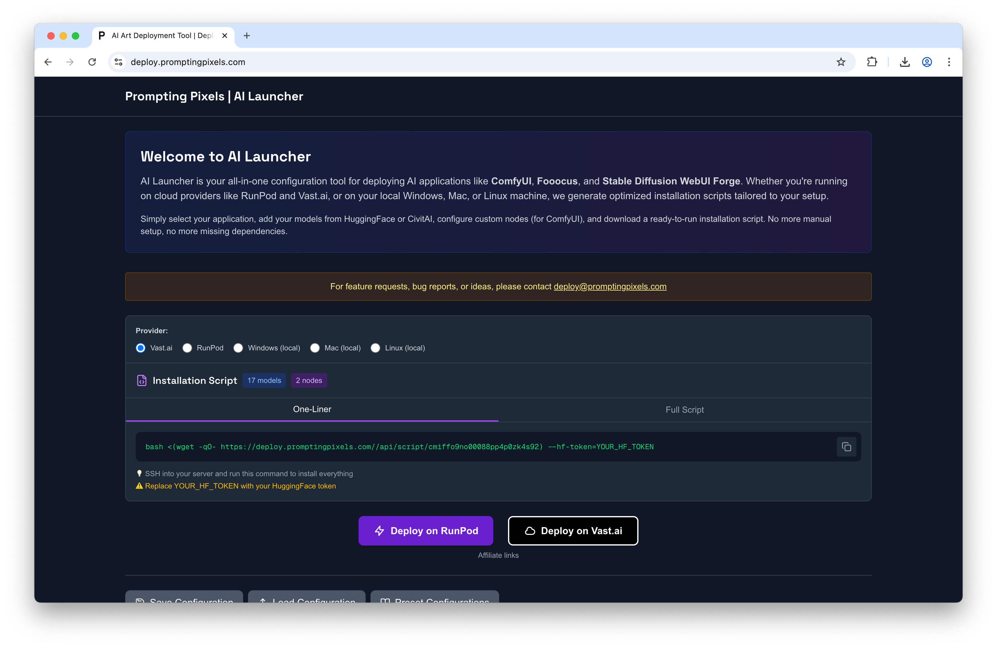 If you want a one-liner that includes ComfyUI + model selection + nodes: